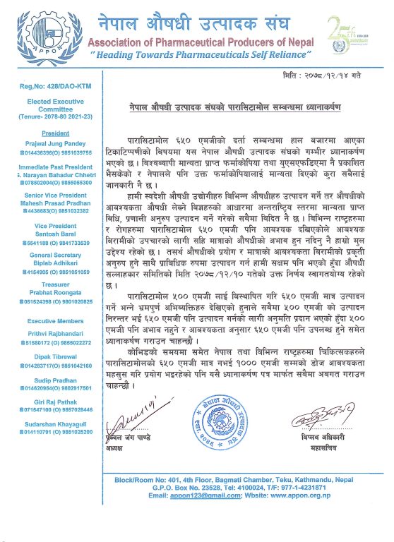 पारासिटामोल ५०० एमजी लाई बिस्थापित गरि ६५० एमजी मात्र उत्पादन गर्ने भन्ने भ्रमपुर्ण अभिब्यक्तिहरु देखिएको हुनाले सबैमा ५०० एमजी को उत्पादन निरन्तर भई ६५० एमजी पनि उत्पादन गर्न अनुमति प्रदान भएको हुँदा ५०० एमजी पनि अभाव नहुने र आबश्यकता अनुसार ६५० एमजी पनि उपलब्ध हुने संघका अध्यक्ष प्रज्वल जंग पाण्डेले बताउनुभएको छ ।