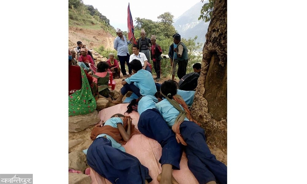 फोटो: पहिचान हुन नसकेको रोगले विरामी भएपछि आइतबार भुईँमै सुताइएका पश्चिम रुकम बाँफिकोट गाउँपालिका–१ स्थित जनएकता आधारभूत विद्यालयका विद्यार्थी । तस्बिर:हरि गौतम/कान्तिपुर