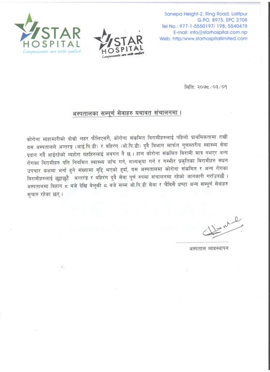 जनस्वास्थ्य सरोकार, ललितपुर । ललितपुरको सानेपास्थित स्टार अस्पतालले कोरोना संक्रमित र अन्य रोगका बिरामीहरुका लागि छुट्टा छुट्टै अन्तरंङ्ग र वहिरंग सेवा सञ्चालन भइरहेको जनाएको छ ।