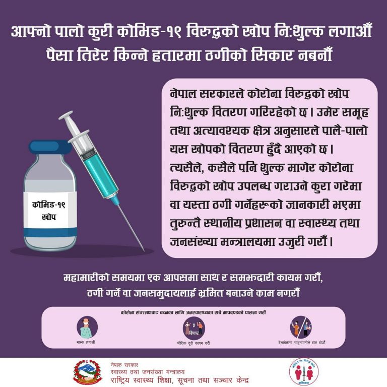 'सरकारले कोरोना भाइरस विरुद्धको खोप निःशुल्क विवरण गर्दै आइरहेको छ',सूचनामा भनिएको छ-'त्यसैले कसैले पनि शुल्क मागेर खोप उपलब्ध गराउने कुरा गरेमा वा त्यस्ता ठगी गर्नेको जानकारी तुरुन्तै स्थानीय प्रशासन वा मन्त्रालयमा उजुरी गरौ ।'
