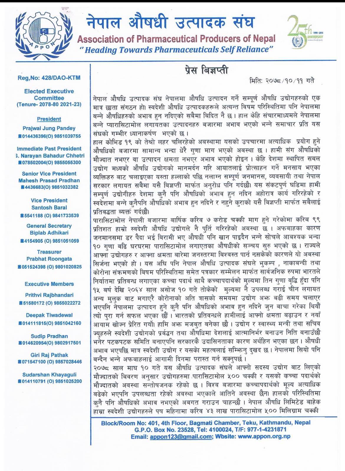 यस परिस्थितिमा औषधि उत्पादकहरु, नेपाल सरकार, औषधि व्यवस्था विभाग, आयातकर्ता, थोक, खुद्रा सबैको सहकार्यमा कुनै पनि औषधिको अभावन हुन नदिन एक अर्कालाई सँधै झै समन्वय एवं सहयोग गरी अगाडि बढ्न सहयोगको अपेक्षा संघले गरेको छ ।