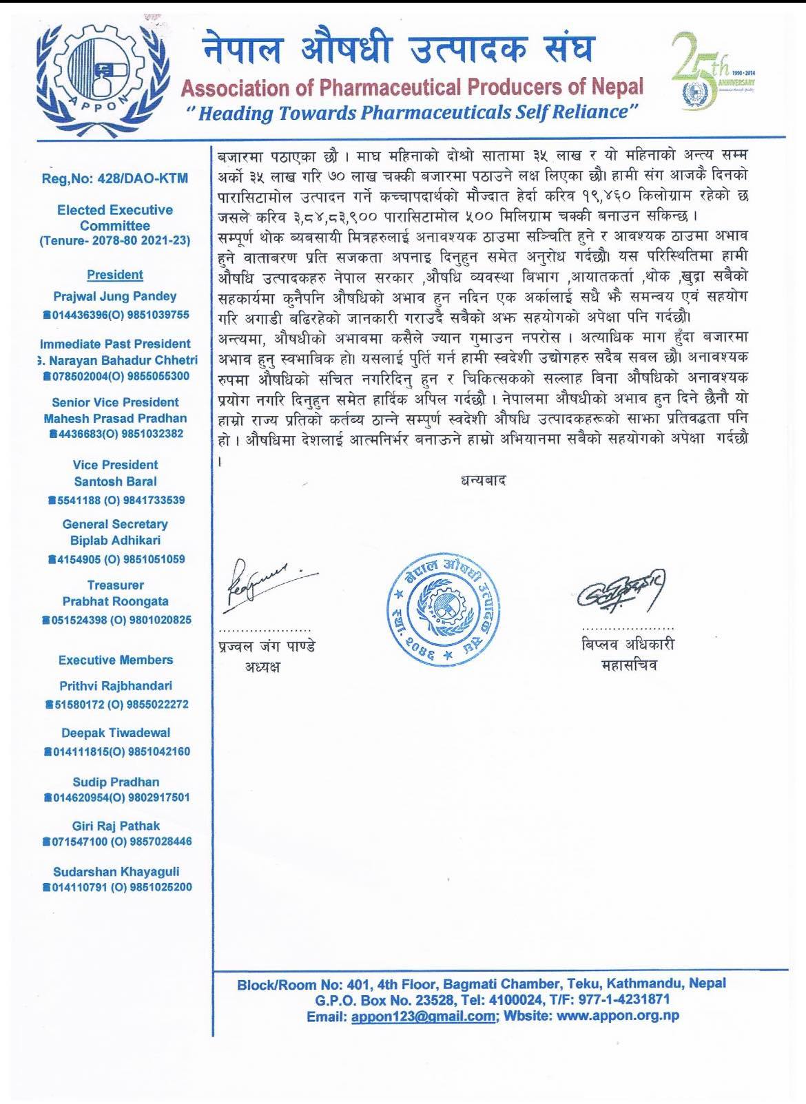 अध्यक्ष प्रज्वलजंग पाण्डे र महासचिव विप्लव अधिकारीद्धारा हस्ताक्षरित विज्ञप्तिमा आजको दिनको परासिटामोल उत्पादन गर्ने कच्चा पदार्थको मौज्दात हेर्दा करिब १९ हजार ४६० किलोग्राम रहेको र यसले करिब ३८ करोड ४८ लाख ३ हजार ९ सय पारासिटामोल ५०० मिलिग्राम चक्की बनाउन सकिने उल्लेख गरिएको छ ।