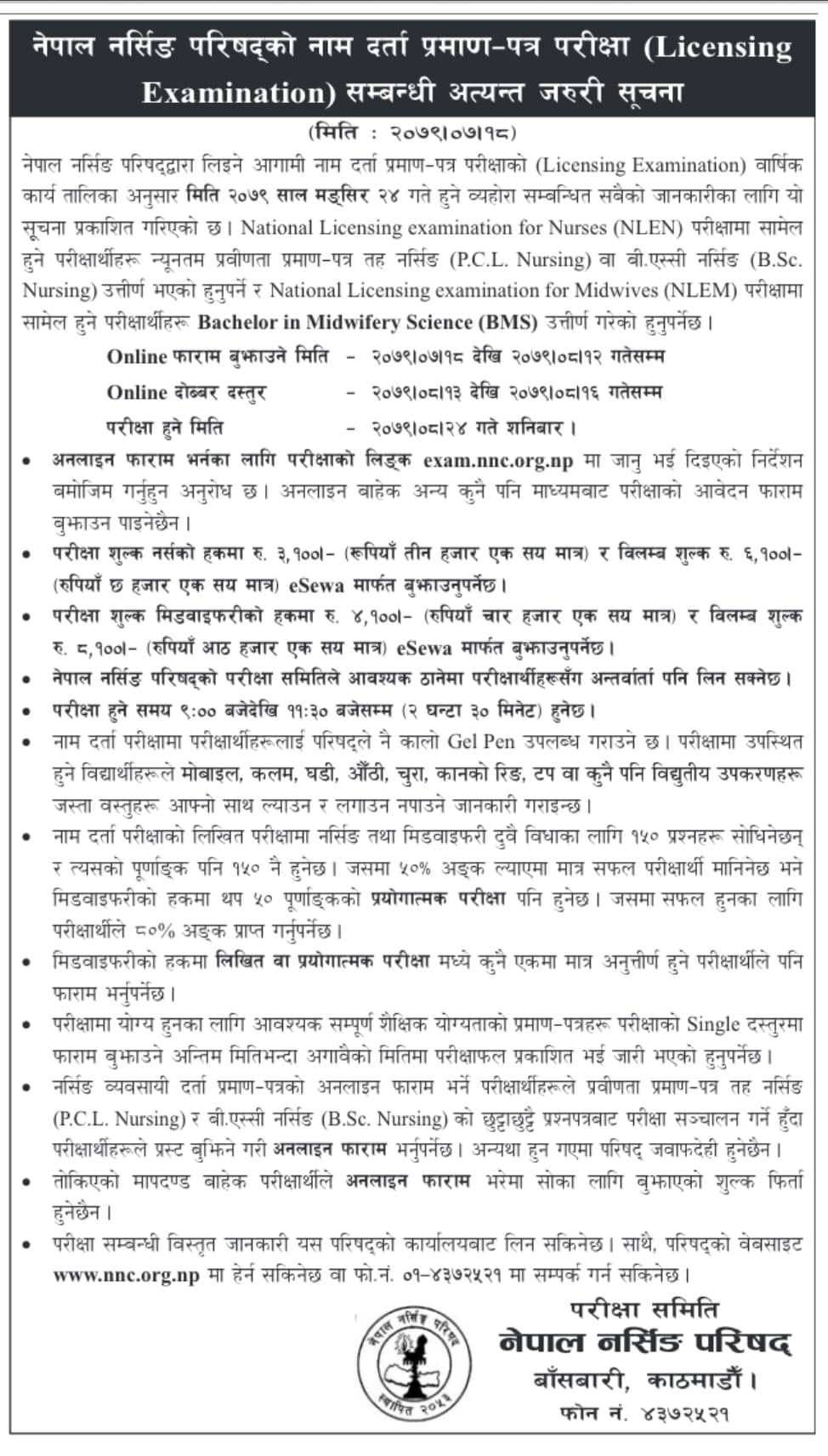 यसैगरी नेशनल लाइसेन्सिङ एक्जामिनेसन फर मिडवाइभ्स परीक्षामा सामेल हुने परीक्षार्थीहरु ब्याच्लर इन मिडवाइफरी साइन्स उत्तीर्ण गरेको हुनुपर्ने सूचनामा उल्लेख छ । अनलाइनबाट फारक भर्नुपर्ने छ । यही कात्तिक १२ गतेदेखि १८ गतेसम्म अनलाई फाराम बुझाउनुपर्ने उल्लेख गरिएको छ ।