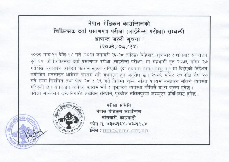 जनस्वास्थ्य सरोकार, काठमाडौँ । नेपाल मेडिकल काउन्सिलको ६४ औँ चिकित्सक दर्ता प्रमाणपत्र (लाइसेन्स) परीक्षाको आगामी माघको दोस्रो साता हुने भएको छ। काउन्सिलले आगामी आगामी १२ देखि १४ माघसम्म परीक्षा तालिका तोकेको छ।