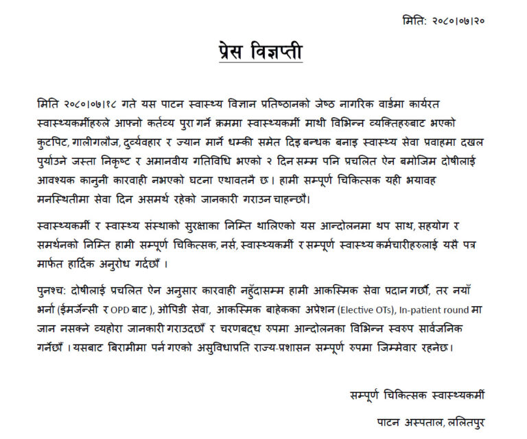 जनस्वास्थ्य सरोकार, काठमाडौं । पाटन अस्पतालमा आकस्मिक बाहेकका सबै सेवा ठप्प पारिएको छ ।