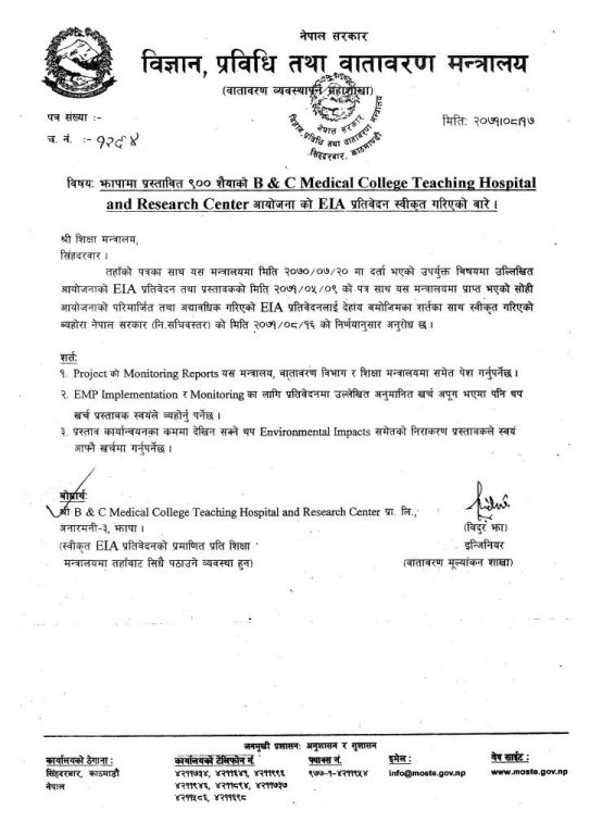 मनशाय पत्र लिएर मेडिकल कलेजको सम्बन्धनको प्रक्रियामा रहेको झापाको बीएण्डसी मेडिकल कलेजलाई सम्बन्धन दिन चिकित्सा शिक्षा ऐनको दफा १३ को उपदफा ६ को व्यवस्था नै काफी छ ।
