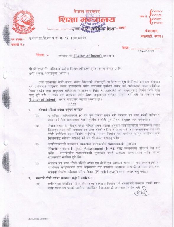 तत्कालीन शिक्षा मन्त्रालयले झापाको अनारमुनी गाउँविकास समितिमा एमबीबीएस कार्यक्रम सञ्चालन गर्न कलेजलाई मनसाय पत्र (लेटर अफ इन्टेन्ट) २०६८ माघ २४ गते प्रदान गरेको थियो । उच्च प्राविधिक शिक्षा तथा अनुुगमन समितिको सिफारिसको आधारमा प्रदान गरिएको सो पत्रमा एकवर्षभित्रमा ३०० श्ययाको अस्पतालको पूर्वाधार तथा महाविद्यालय सञ्चालन सम्बन्धमा वातावरणीय प्रभाव मूल्याङ्न गर्नुपर्ने लगायत शर्त राखिएको थियो ।