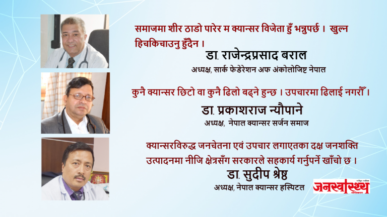 सार्क फेडेरेशन अफ अंकोलोजिष्ट, नेपालका अध्यक्ष डा. राजेन्द्रप्रसाद बरालका अनुसार, क्यान्सर जनुसुकै लिङ्ग, उमेर र पेशाकर्मी जो सुकैलाई हुनसक्छ । समयमै पहिचान गरी उपचार शुरु गर्ने हो भने निको हुन्छ । क्यान्सरसँग जुध्न दृढ आत्मविश्वास चाहिन्छ ।’— डा. बरालले भन्नुहुन्छ ।