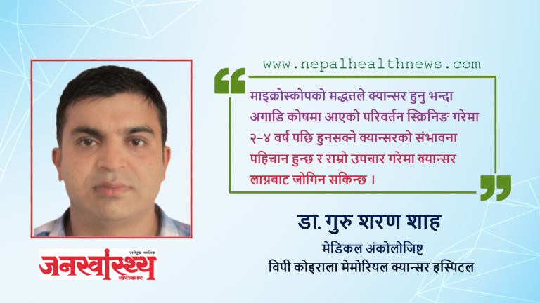 जनस्वास्थ्य सरोकार । क्यान्सर चाँडो पत्ता लगाउन सकेमा यसको राम्रो उपचार गर्न सकिन्छ । यसका लागि नियमित रुपमा शारीरिक परीक्षण एवं ल्याव परीक्षण गराउन जरुरी हुन्छ ।