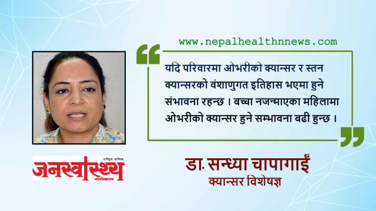 जनस्वास्थ्य सरोकार । ओभरीको क्यान्सर किटान गर्न सकिने कारणहरु छैनन् । तर केही तत्वहरुले ओभरीको क्यान्सर हुने सम्भावना वढाउँछ । जस्तै— बढ्दो उमेर (४०–५० वर्ष), पहिले कुनै क्यान्सर (जस्तै स्तन, पाठेघरको, लामो आन्द्राको) भएको भएमा ओभरीको क्यान्सर हुने सम्भावना हुन्छ । यदि परिवारमा ओभरीको क्यान्सर र स्तन क्यान्सरको वंशाणुगत इतिहास भएमा हुने संभावना रहन्छ । बच्चा नजन्माएका महिलामा ओभरीको क्यान्सर हुने सम्भावना बढी हुन्छ । उपचारको क्रममा लामो समय सम्म हर्मोन दिएको अवस्थामा पनि यसको सम्भावना बढेर जान्छ ।