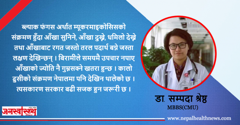 यसको मतलब यो होइन कि हरेक कोविड संक्रमित बिरामीलाई म्युकोरमाइकोसिसले संक्रमित गर्छ । यो असामान्य रोग हो । डायविटिजका र कोभिड–१९ संक्रमित बिरामीको आँखा, नाकमा ढुसी जम्न सक्छ । यो दिमाग भित्र फैलियो भने बिरामीको मृत्यु पनि हुन सक्छ । फंगल एउटा मानिसबाट अर्को मा सर्दैन । एकदमै कमजोर शरीर भएकोलाई देखा पर्नसक्छ ।