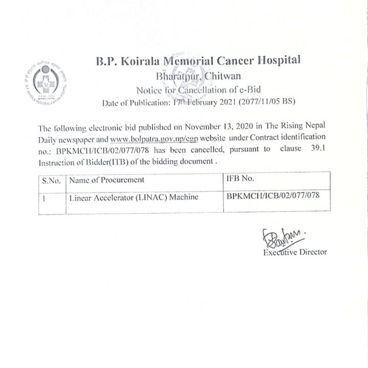 बी.पी. कोइराला मेमोरियल क्यान्सर अस्पतालले लिनियर एसेलेटर (लिनियाक) मेसिन खरीदका लागि २०२० को नोभेम्बर १३ मा पहिलो टेन्डर आव्हान गरेको थियो । अस्पतालको टेक्निकल कमिटीले तयार पारेको स्पेशिफिकेसनका आधारमा अमेरिकाको भेरियन कम्पनि र स्वीडेनको इलेक्टा कम्पनिले टेन्डरमा भाग लिएका थिए ।
