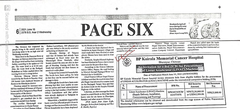 जनस्वास्थ्य सरोकार, चितवन । विपी कोइराला मेमोरियल क्यान्सर अस्पतालमा कार्यकारी निर्देशकको चलखेलका कारण क्यान्सर सेकाइमा प्रयोग हुने अत्याधुनिक लिनियर एसेलेटर (लिनियाक) मेसिन टेन्डर गरेको एक वर्ष वितिसक्दा पनि भित्रिन सकेको छैन ।