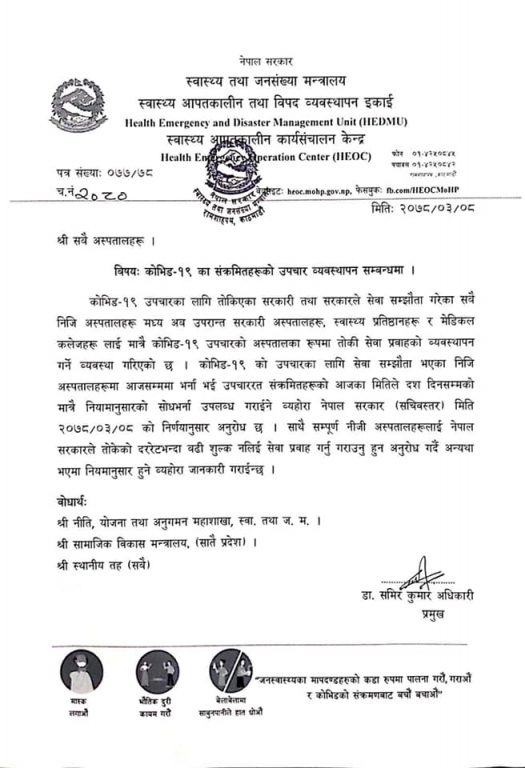 जनस्वास्थ्य सरोकार, काठमाडौँ । सरकारले अब कोभिड– १९ को सङ्क्रमितको उपचार सरकारी अस्पताल, स्वास्थ्य प्रतिष्ठान र मेडिकल कलेजमा मात्र गर्ने भएको छ ।