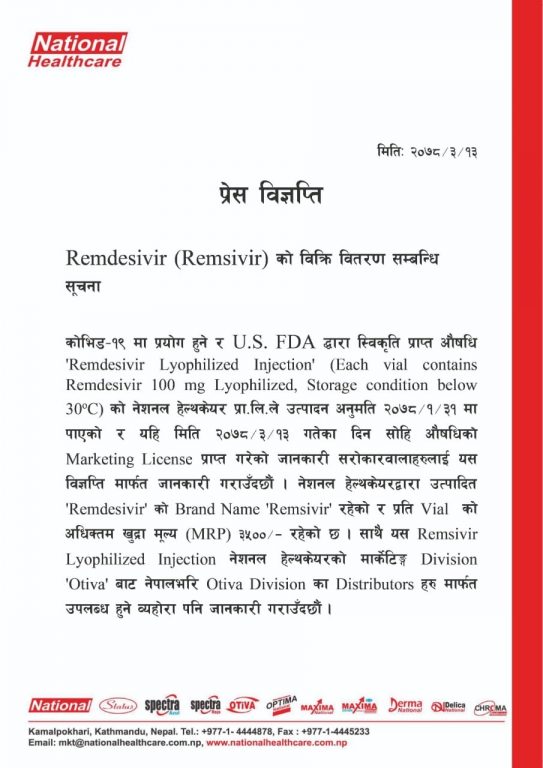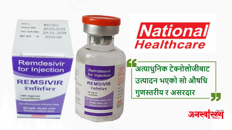 जनस्वास्थ्य सरोकार, काठमाडौँ । मुलुकको अग्रणी औषधि कम्पनि नेसनल हेल्थ केयर प्रा. लिले कोरोना भाइरस (कोभिड-१९) संक्रमितको उपचारमा प्रयोग हुने रेम्डिसिभिर औषधि उत्पादन गरी विक्री वितरण सुरु गरेको छ ।