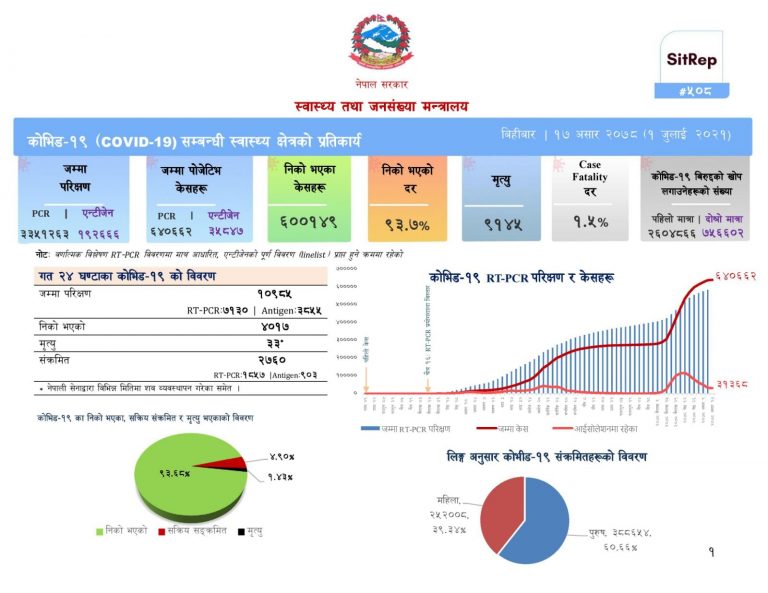 जनस्वास्थ्य सरोकार, काठमाडौँ । देशभर थप २ हजार ७६० जनामा संक्रमण पुष्टि भएको छ । पछिल्लो २४ घन्टामा १० हजार ९८५ जनामा आरटी पीसीआर र एन्टिजेन परीक्षण गर्दा २ हजार ७६० जनामा संक्रमण पुष्टि भएको मन्त्रालयले जनाएको छ।