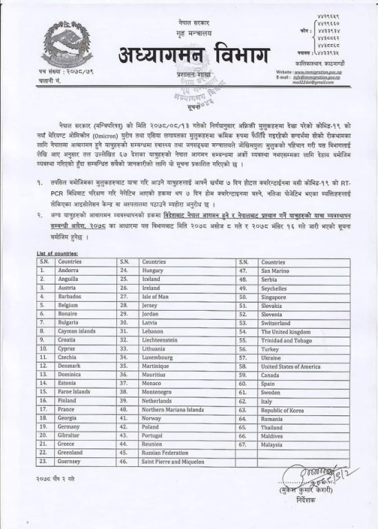 विभागले शुक्रबार मन्त्रिपरिषद्को निर्णय भन्दै ओमिक्रोन देखिएका ति मुलुकबाट नेपाल आउँदा सात दिन अनिवार्य होटेल क्वारेन्टाइनमा बस्नुपर्ने सूचना जारी गरेको थियो। जोखिमयुक्त मानिएका ६७ देशबाट नेपाल प्रवेश गर्ने यात्रुले सात दिन आफ्नै खर्चमा होटल क्वारेन्टिनमा बस्नुपर्ने र आरटी पीसीआर विधिबाट परीक्षण गर्नुपर्ने भनिएको थियो ।