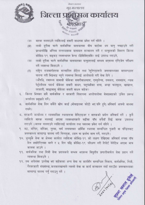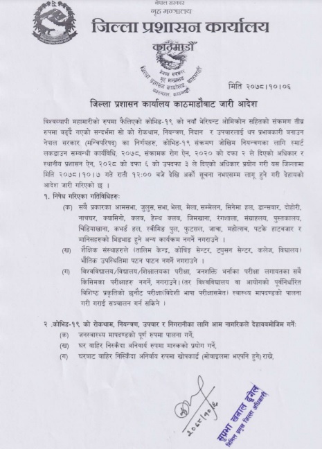 कोभिड १९ प्रकोप उच्च हुँदै गएपछि काठमाडौं जिल्ला प्रशासन कार्यालयले आज राति १२ बजेबाट लागू हुने गरी सो आदेश जारी गरेको हो ।