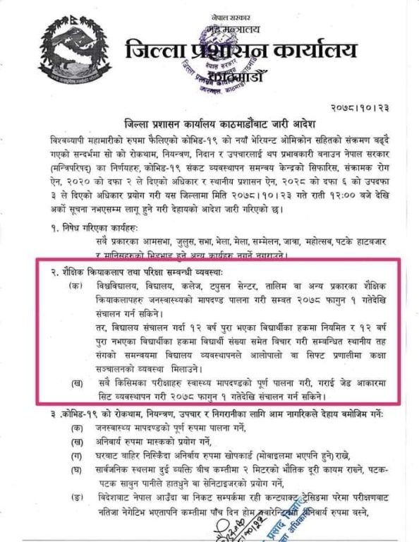 यस्तै, उपत्यकाका तीन प्रमुख जिल्ला अधिकारीको बैठकले फागुन १ गतेदेखि भौतिकरुपमा कक्षा सञ्चालन गर्न सकिने निर्णय गरेको छ । १२ वर्ष पूरा भएका बालबालिकालाई स्वास्थ्य मापदण्ड पालना गरेर नियमित कक्षामा सहभागी हुन दिने तथा १२ वर्षमुनिका बालबालिका भने बारअनुसार आलोपालो कक्षामा सहभागी गराउने निर्णय गरेको छ ।