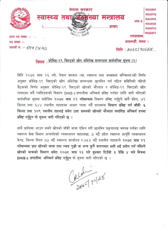 स्वास्थ्य सेवा विभाग अन्तर्गतको व्यवस्थापन महाशाखा, ७ वटै प्रदेश स्वास्थ्य आपूर्ति व्यवस्थापन केन्द्र, जिल्लास्थित ७७ वटै स्वास्थ्य कार्यालय, ७५३ वटै स्थानीय तहहरूले माघ २१ गतेसम्ममा प्राप्त खोपको मात्रा, म्याद गुज्री वा अन्य कुनै कारणबश क्षती भई प्रयोग गर्न नमिल्ने खोपको मात्राको विवरण माघ २६ गते बुधबार दिउँसो ३ देखि ४ बजे भित्रमा डिएचआइएस टु प्रणालीमा अनिवार्य प्रविष्ट गर्न मन्त्रालयले निर्देशन दिएको छ ।