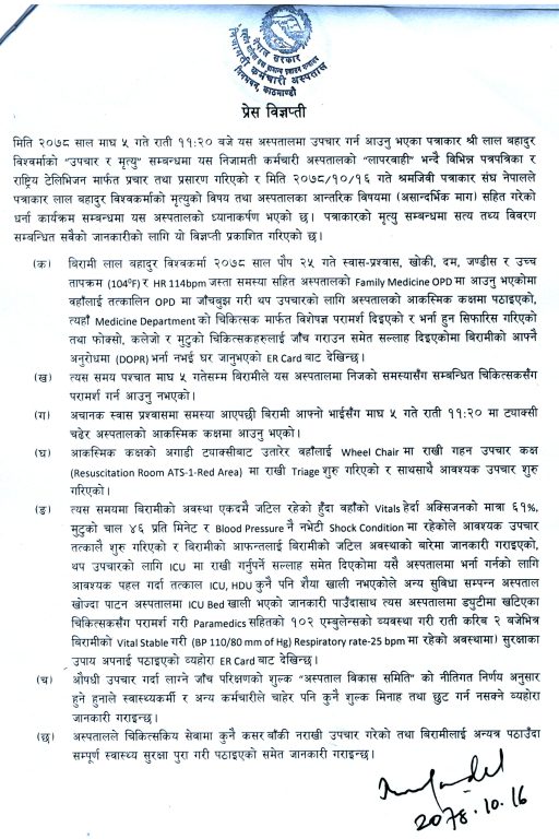 जनस्वास्थ्य सरोकार, कठमाडौं । पत्रकार एलबी विश्वकर्माको मृत्यु सिभिलसर्भिस हस्पिटलको लापरबाहीले नभएको छानबीन समितिले निष्कर्ष निकालेको छ ।