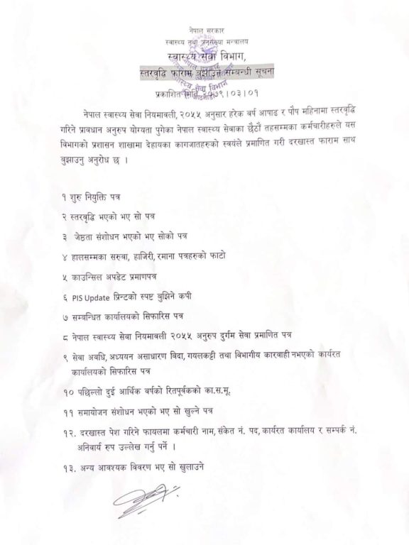 स्वास्थ्य सेवा नियमावली, २०५५ अनुसार हरेक वर्ष असार र पुसमा स्तरवृद्दि गरिने प्रावधान अनुरुप योग्यता पुगेका छैठौं तहका कर्मचारीलाई दरखास्त दिन विभागले सुचित गरेको हो।