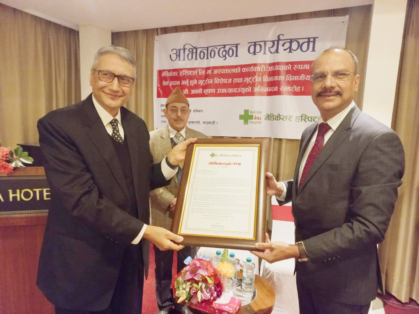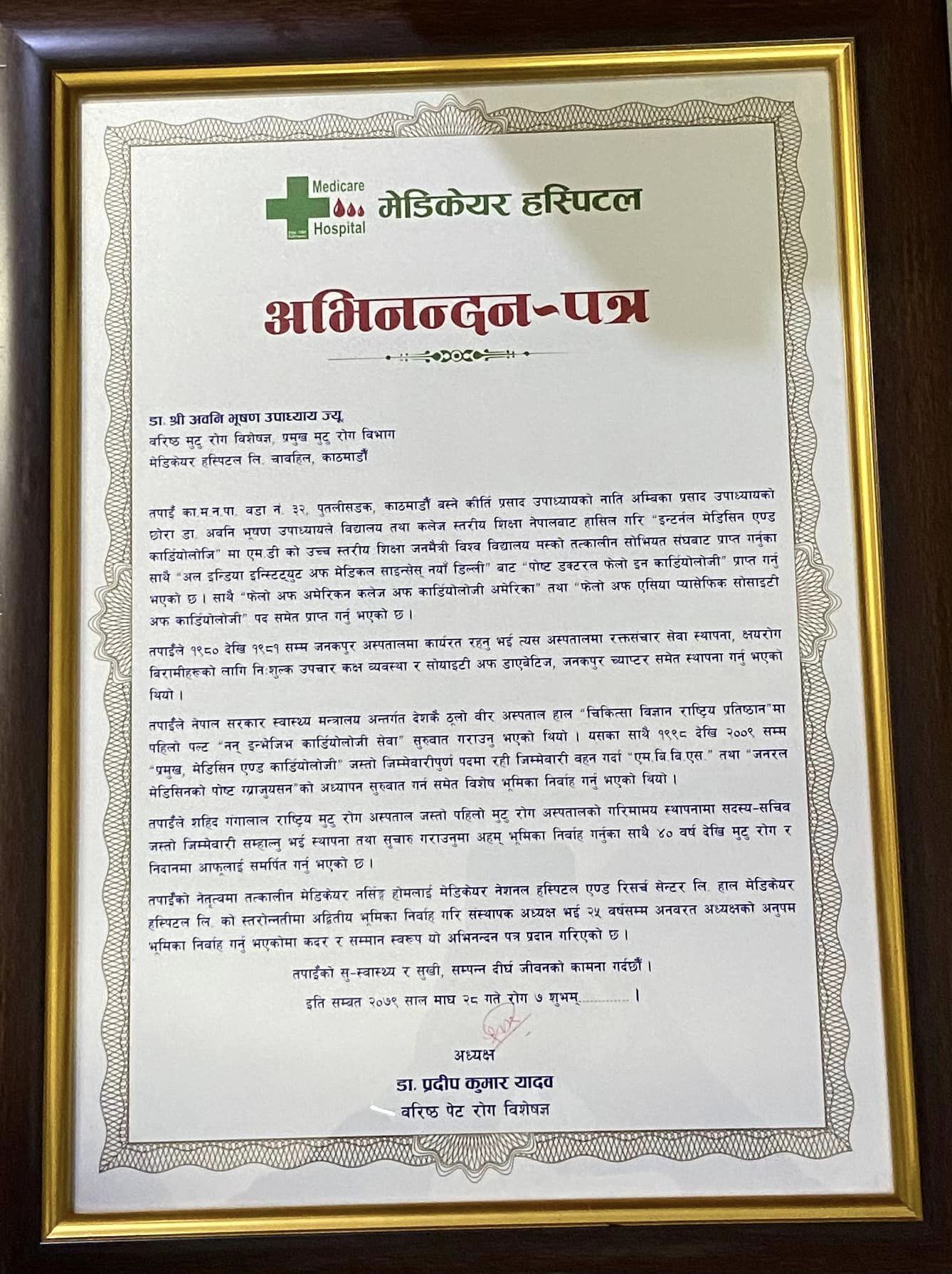 जनस्वास्थ्य सरोकार, काठमाडौं । ४० वर्षदेखि मुटु रोग र निदानमा आफूलाई समर्पित गर्दै आउनुभएका वरिष्ठ मुटुरोग विशेषज्ञ डा. अवनि भूषण उपाध्ययलाई मेडिकेयर अस्पतालले अभिनन्दन गरेको छ । अस्पतालको कार्यकारी अध्यक्षको रुपमासमेत २५ वर्ष सेवा प्रदान गर्नुहुने डा. उपाध्यलाई अस्पतालले अभिनन्दन गरेको हो ।