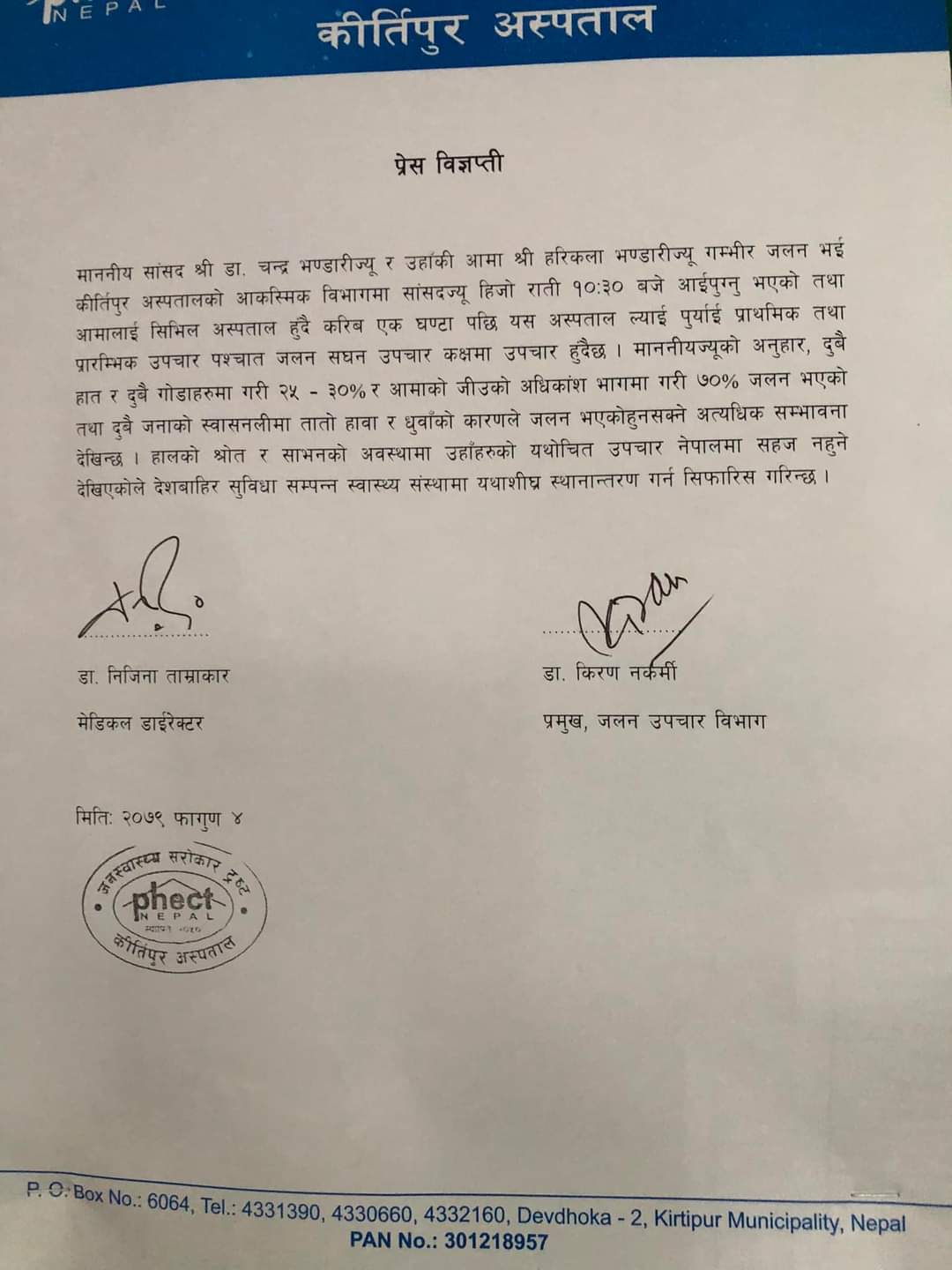 हालको श्रोत र साधनको अवस्थामा उहाँहरुको यथोचित उपचार नेपालमा सहज नहुने देखिएकाले देशबाहिरको सुविधासम्पन्न स्वास्थ्य संस्थामा यथाशीघ्र स्थानान्तरण गर्न अस्पतालले सिफारिस गरेको हो ।