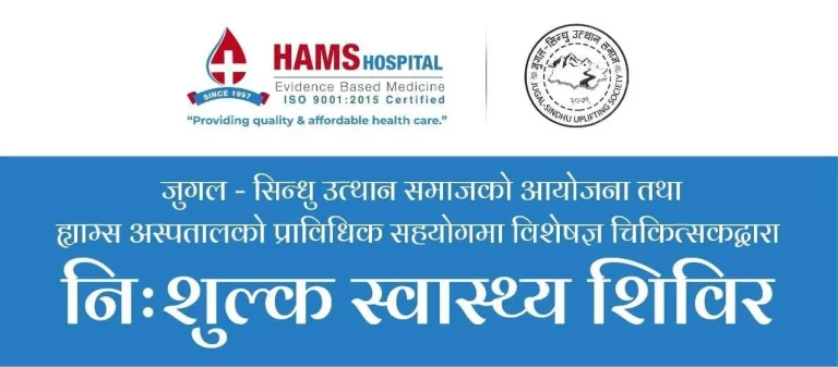 जुगल–सिन्धु उत्थान समाजको आयोजना तथा ह्याम्स अस्पतालको प्रविधिक सहयोगमा विशेषज्ञ चिकित्सकद्वारा आगामी वैशाख १६ गते शनिबार स्वास्थ्य शिविर सञ्चालन गर्न लागिएको हो । शिविर विहान १० बजेदेखि दिउँसो ४ बजेसम्म सञ्चालन हुने छ ।