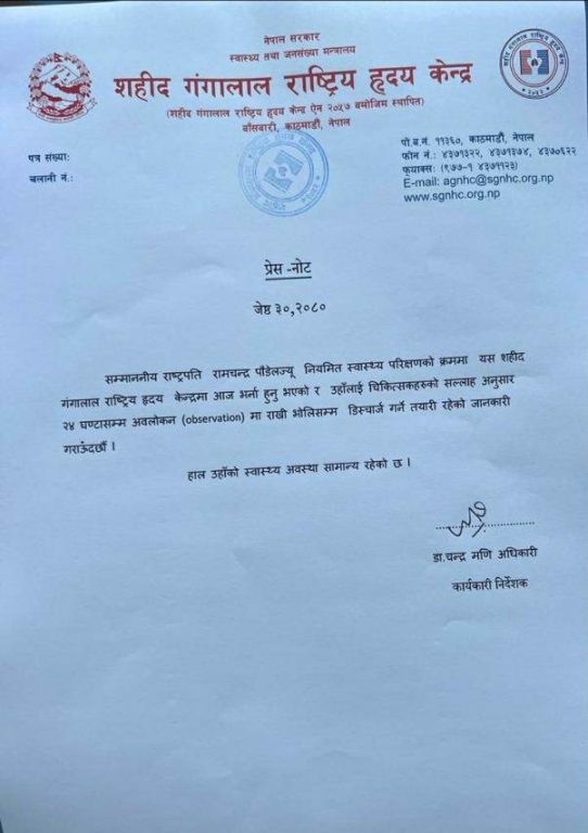 एन्जिओग्रामको शुरुवातीको रिपोर्ट राम्रो रहेको अस्पताल श्रोतले जानकारी गराएको छ । २४ अण्टाको अव्जर्भेसनपश्चात् उहाँलार्य भोलित डिस्चार्ज गरिने जनाइएको छ ।