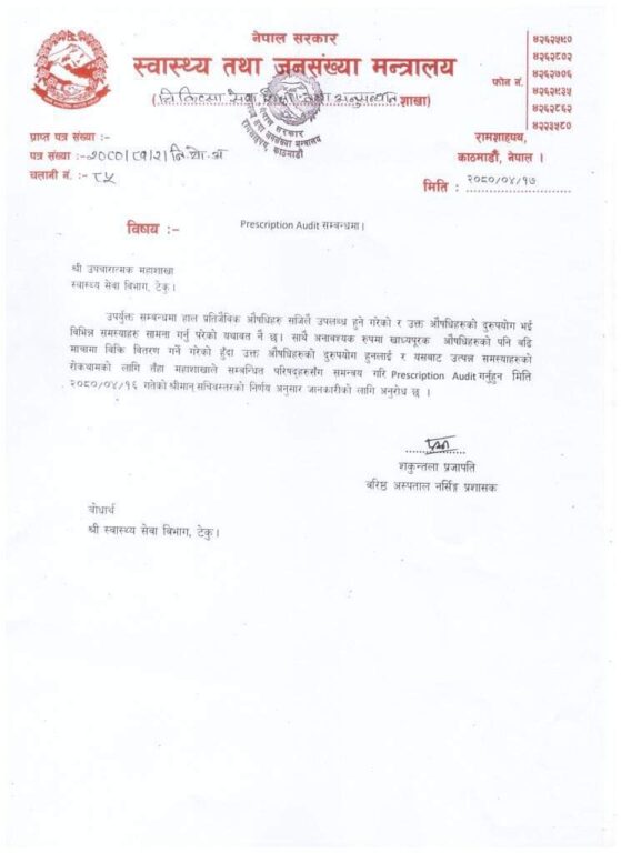 मन्त्रालयले साउन १६ गते सचिवस्तरीय निर्णय गर्दै प्रेस्किप्सनको अडिट गर्ने निर्णय कार्यान्वयनमा ल्याउन उपचारात्मक महाशाखालाई पत्राचारसमेत गरेको हो ।
