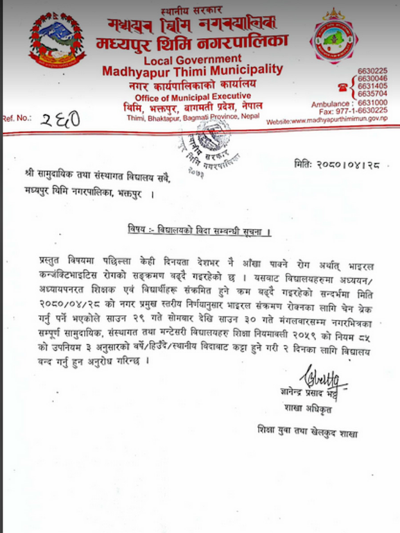 जनस्वास्थ्य सरोकार, भक्तपुर । देशभर आँखा पाक्ने रोग अर्थात् भाइरस कन्जङ्क्टिभाइटिस रोगको संक्रमण बढेको भन्दै मध्यपुर थिमी नगरपालिकाले सबै विद्यालय बन्द गरेको छ ।