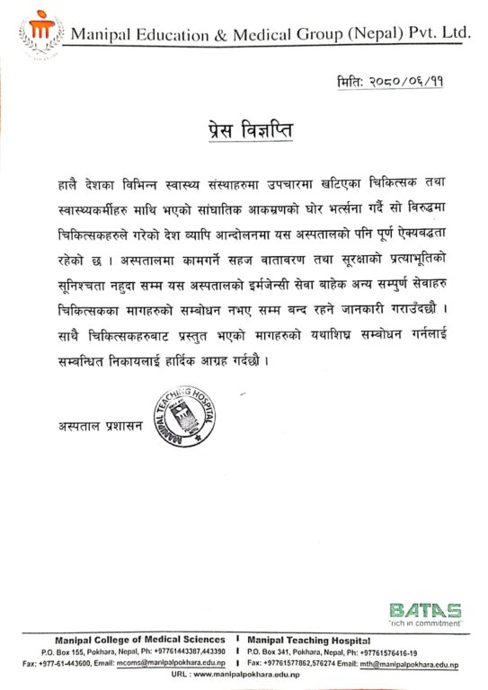 अस्पताल प्रशासनले अस्पतालमा काम गर्ने वातावरण र सुरक्षाको प्रत्याभूति सुनिश्चित नहुँदा सम्म आकस्मिक बाहेक अन्य सेवा बन्द रहने जनाएको छ ।