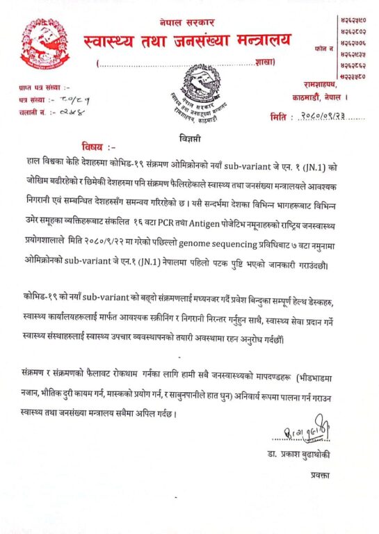 स्वास्थ्य तथा जनसंख्या मन्त्रालयले सोमबार विज्ञप्ति जारी गर्दै नयाँ सब भेरियन्ट जेएन.१ नेपालमा पनि फेला परेको जनाएको छ ।