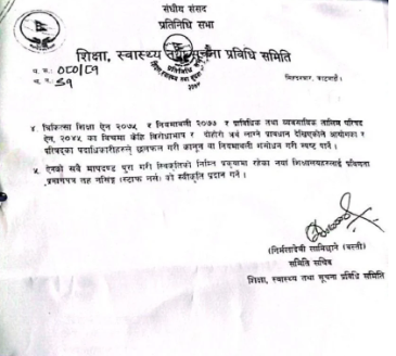 प्राविधिक शिक्षा तथा व्यावसायिक तालिम परिषद् ऐन, २०४५ अनुसार सञ्चालनमा रहेका स्वास्थ्य तर्फका प्रवीणता प्रमाण पत्र तह मेडिकल, डेन्टल र नर्सिङका कार्यक्रमहरूका सम्बन्धमा द्विविधा सृजना भएको छ । मेडिकल, डेन्टलतर्फ कार्यक्रमहरू पूर्ववत् सुचारु रहेका छन् । तर, नर्सिङतर्फ भर्ना अवरुद्ध छ । समितिले यसलाई अव्यवहारिक भन्दै यथावत् भर्ना लिई कक्षा सञ्चालन गर्न शिक्षा विज्ञान तथा प्रविधि मन्त्रालयमार्फत परिषद्लाई निर्देशन दिएको हो ।