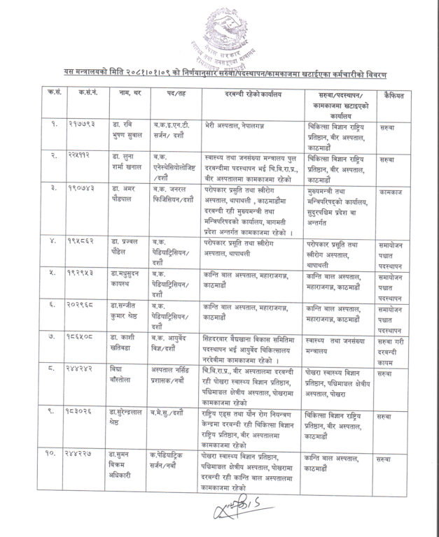नेपाल हेल्थ न्युज, काठमाडौँ । स्वास्थ्य तथा जनसंख्या मन्त्रालयले मन्त्रालय र माताहतका निकायमा कार्यरत १० जना कर्मचारीलाई सरुवा, पदस्थापन र कामकाजमा खटाएको छ।
