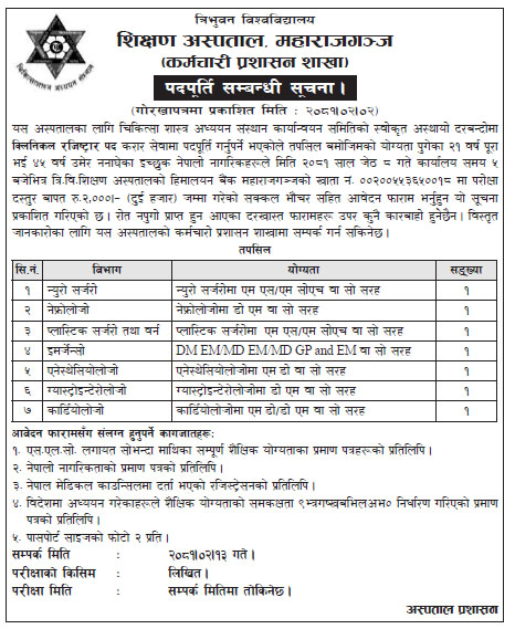 योग्यता पुगेका २१ वर्ष पूरा भई ४५ वर्ष उमेर ननाघेका इच्छुक नेपाली नागरिकहरूले जेठ ८ गते कार्यालय समयभित्र आवेदन फाराम भर्न अस्पतालले आग्रह गरेको छ ।