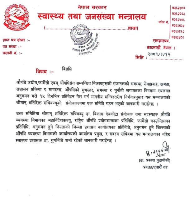 नेपाली औषधी उद्योग, औषधी थोक बिक्रेता तथा फार्मेसीको गुणस्तर र सञ्चालनमा देखिएका समस्यालाई सम्बोधन गर्न समिति गठन गरिएको हो । मन्त्री यादवले मन्त्रालयले औषधी ऐन, २०३५ एवम् अन्य प्रचलित कानुनको पालना भए–नभएको सुनिश्चित गर्न समिति गठन गर्नुभएको हो ।