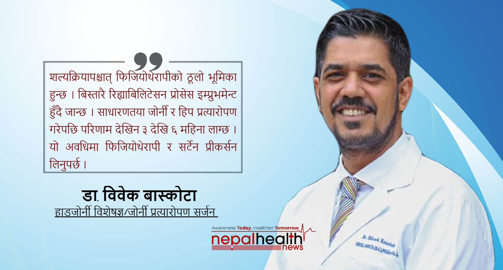 शल्यक्रियापश्चात् फिजियोथेरापीको ठूलो भूमिका हुन्छ । बिस्तारै रिह्याबिलिटेसन प्रोसेस इम्प्रुभमेन्ट हुँदै जान्छ । साधारणतया जोर्नी र हिप प्रत्यारोपण गरेपछि परिणाम देखिन ३ देखि ६ महिना लाग्छ । यो अवधिमा फिजियोथेरापी र सर्टेन प्रीकर्सन लिनुपर्छ । जसले हिपको ज्वाइन्ट डिसलोकेशन नहोस् । इन्डिकेशन राम्रो छ भने बिरामीको दुःखाइ कम हुदै जान्छ । जसले जीवनको गुणस्तर सुधार हुन्छ ।