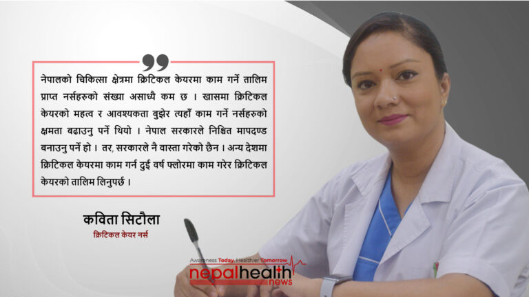 नेपालको चिकित्सा क्षेत्रमा क्रिटिकल केयरमा काम गर्ने तालिम प्राप्त नर्सहरुको संख्या असाध्यै कम छ । खासमा क्रिटिकल केयरको महत्व र आवश्यकता बुझेर त्यहाँ काम गर्ने नर्सहरुको क्षमता बढाउनु पर्ने थियो । नेपाल सरकारले निश्चित मापदण्ड बनाउनु पर्ने हो । तर, सरकारले नै वास्ता गरेको छैन । अन्य देशमा क्रिटिकल केयरमा काम गर्न दुई वर्ष फ्लोरमा काम गरेर क्रिटिकल केयरको तालिम लिनुपर्छ ।