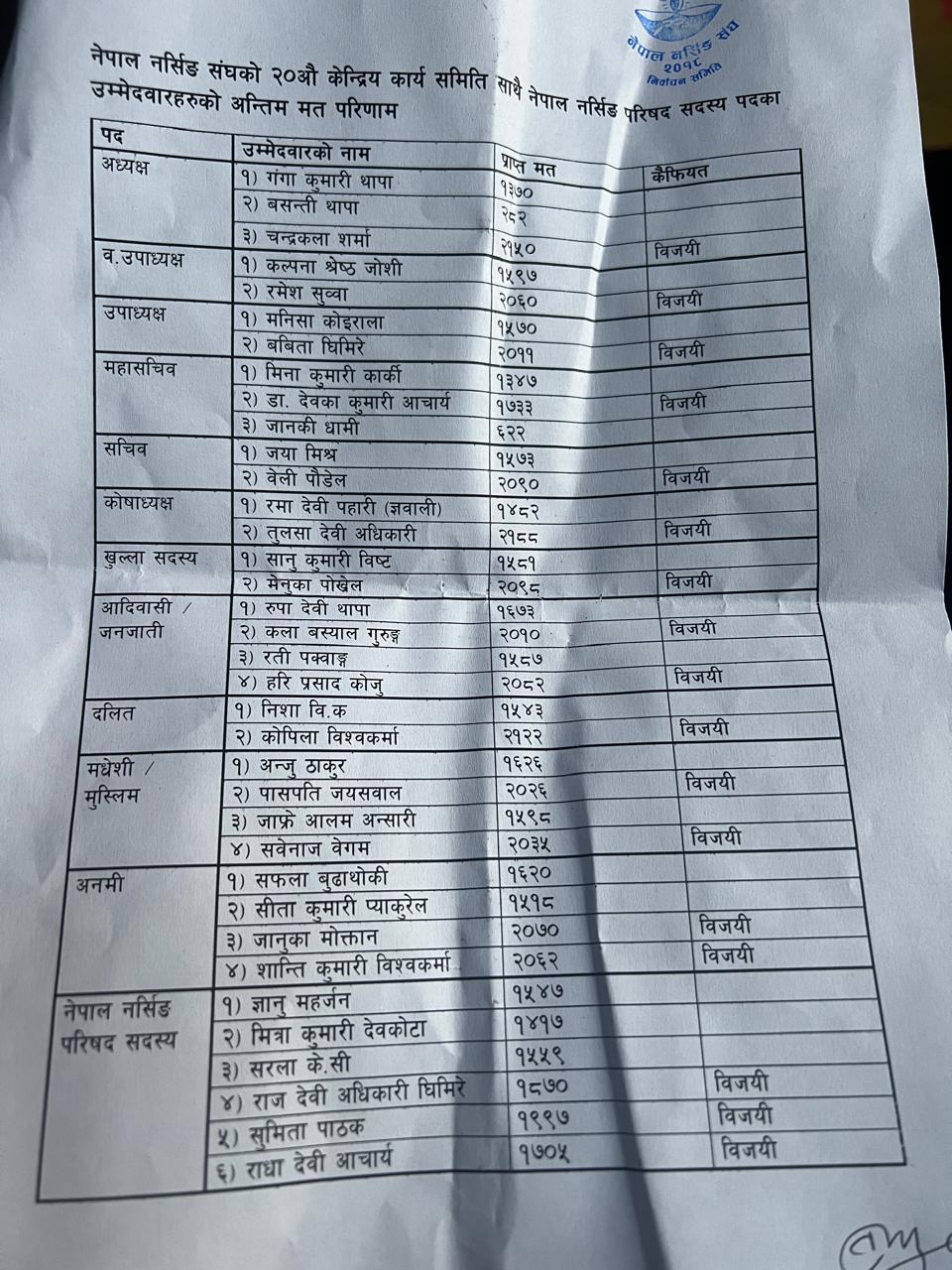 यसैगरी, बरिष्ठ उपाध्यक्षमा शर्मा समूहका रमेश सुब्बाले २ हजार ६० मत प्राप्त गरेर निवार्चित हुनुभयो भने उनका प्रतिस्पर्धी कल्पना श्रेष्ठ जोशीले १५९७ मत मात्रै प्राप्त गर्नुभयो। उपाध्यक्षमा २०११ मत ल्याएर बबिता घिमिरेले जित हासिल गरेकी छिन्। उपाध्यक्षकी अर्की उम्मेदवार मनिसा कोइरालाको १५७० मत आएको छ।