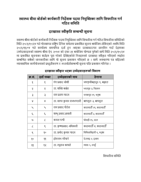 यसअघि माघ २४ गते स्वास्थ्य बीमा बोर्डको कार्यकारी निर्देशक पदका लागि दरखास्त आह्वान भएको थियो ।