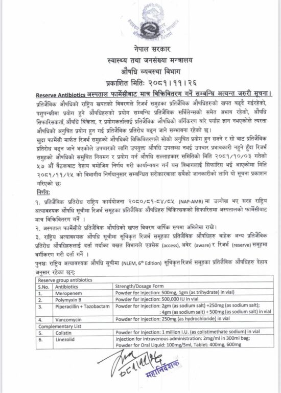 विभागले एक सुचना जारी गर्दै मेरोपेनम, कोलिस्टिन लगायत विभिन्न ६ प्रकारका रिजर्भ ग्रुपका एन्टिबायोटिक औषधिलाई अस्पताल फार्मेसीबाट मात्र बेच्न निर्देशन दिएको हो ।