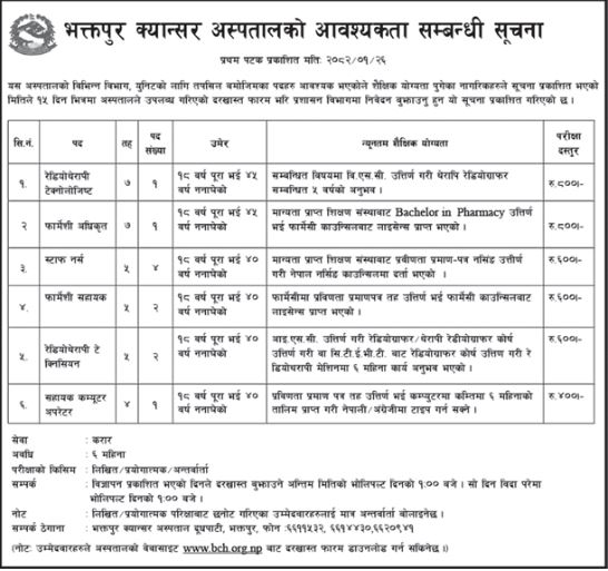 उपलब्ध पदहरूमा रेडियोथेरापी टेक्नोलोजिष्ट, फार्मेसी अधिकृत, स्टाफ नर्स, फार्मेसी सहायक, रेडियोथेरापी टेक्निसियन तथा सहायक कम्प्युटर अपरेटर रहेका छन्। यी सबै पदहरूमा करार अवधिको लागि नियुक्ति गरिने जनाइएको छ।