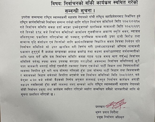 निर्वाचन समितिले विज्ञप्ति जारी गर्दै भनेको छ कि “सर्वसम्मतिको प्रयास भन्दै पटक–पटक समय मागियो, तर अन्तिममा निर्वाचन समितिलाई जानकारी नदिई एकलौटी रूपमा पदाधिकारीको नाम घोषणा गरिएको छ। यस्तो कार्य महासंघ र पार्टीको विधानविपरीत भएकाले बाँकी निर्वाचन प्रक्रिया हाललाई स्थगित गरिएको छ।”