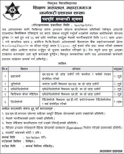 नेपाल हेल्थ न्युज, काठमाडौं । त्रिभुवन विश्वविद्यालय अन्तर्गत रहेको शिक्षण अस्पताल, महाराजगञ्जले करार सेवामा नियुक्त गर्नका लागि क्लिनिकल रजिस्टार पदमा ९ जनाको माग गरेको छ।